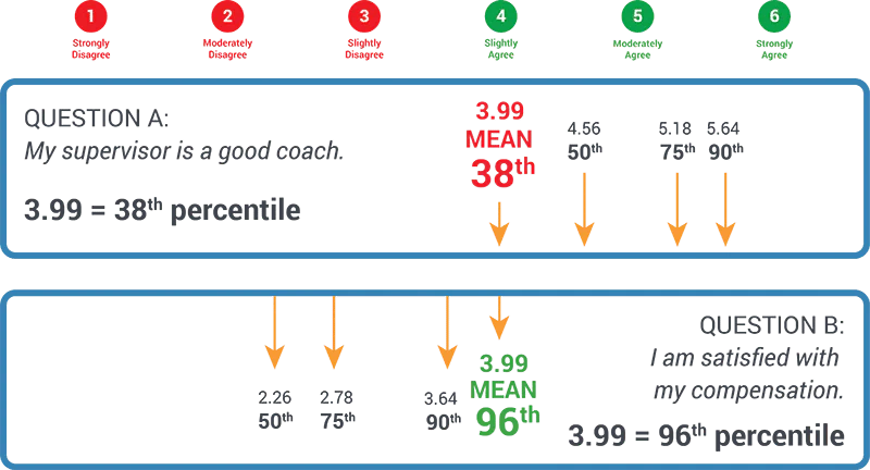 The graphic below shows a specific example of benchmarking in the organizational context. The mean scores of the responses to “My supervisor is a good coach” and “I am satisfied with my compensation” are identical at 3.99. However, when benchmarked against scores from other people, it’s clear that the first has a low score at the 38th percentile and the second has a high score at the 96th percentile.